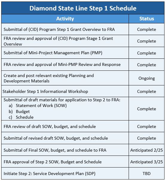| Submittal of (CID) Program Step 1 Grant Overview to FRA | Complete |